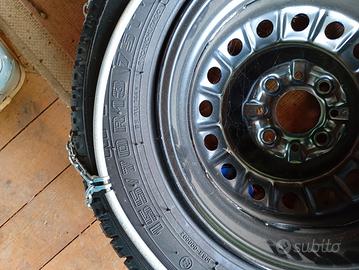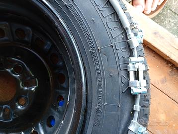 Vendo 2 cerchi con pneumatici e catene, pneumatici ricostruito in Italia della Marangoni e le catene Weissenfels, 155/70/13, il tutto nuovo mai usati, solo esposizione negozio per catena da neve, vista la misura e la quantità disponibile possono andare bene un rimorchio, se bisogno di altre info scrivetemi, grazie.