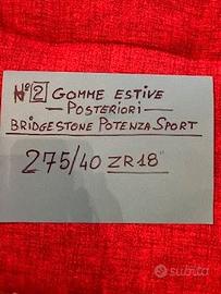 Vendo gomme per sostituzione cerchi da 19" alla mia auto , ottimo stato percorsi km 6.000 , 2 gomme anteriori 245/45 ZR 18" , e 2 gomme posteriori 275/40 ZR18" marca : BRIDGESTONE POTENZA SPORT