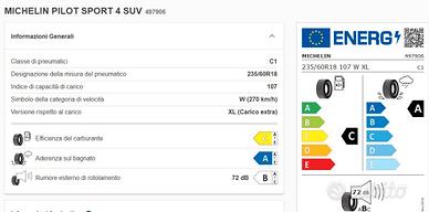 Vendo gomme Michelin Pilot Sport 4 Suv misura 235/60 R18 107W in stato perfetto e pari al nuovo. Le gomme hanno appena 1.500km dimostrabili con data di fattura, tagliando ufficiale rilasciato dal gommista dei km della vettura al montaggio delle gomme e km della vettura ad oggi. Le gomme sono state pagate 820€, vendo per cambio vettura. Regalo nel prezzo Calze da Neve per le gomme mai utilizzate.