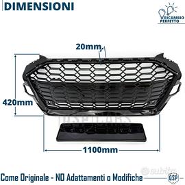 Griglia Anteriore per AUDI A4, S4 (B9) Restyling(19-24), Calandra a Nido d'Ape RS Style, in Abs Nero Lucido | MontaggioPerfetto PLUG and PLAY - Look Rinnovato Rs | Nido d'Ape Ispirazione RS Style. - Ricambio Perfetto | NO Adattamenti o Modifiche. - Rifiniture Estreme | Eccellenza Garantita dei Materiali, Dettagli, Tatto. - Garanzia a Vita | Resistente agli Agenti Atmosferici, Temperature, NOScolorimento. INFO: Rinnova il Look della Tua Audi A4 o S4 sostituendo alla Griglia di Serie, laGriglia Rs Style nero Lucido, Ispirata alle più Recenti Audi Rs. Mascherina in finitura Nero Lucido, di qualità eccellente nella scelta deimateriali, Rifiniture del Dettaglio, tatto, e colorazione. COMPATIBILITÀ: - Per AUDI A4 (B9) Restyling, 2019-2024 - Per AUDI S4 (B9) Restyling, 2019-2024 ** ! NON COMPATIBILE con versione RS4, Allroad** MONTAGGIO: Semplicemente da sostituire all’attuale come perfetto Ricambio: COMPATIBLITA'TESTATA AL 100% DETTAGLI TECNICI: - Materiale: ABS Termico a Pigmentazione - Colore: Nero Lucido - Finitura: Traslucida - Disegno Griglia: Rs, a Nido d'Ape - Verniciatura: Non Verniciata, ABS di Qualità - Peso: 3204 Gr - Dimensioni: 11000 mm (L) - 420 mm (H) - 20mm (P) - Resistenza Schiacciamento: 55Kg - Temperatura di lavoro Compresa tra - 28°C / + 45°C - Confezionamento: Originale PER INFO CONTATTARE AL 3927091031 ANCHE LINEA WhatsApp OPPURE VIA E-MAIL: rtautoitalia2018@libero.it CONSEGNA: - Effettuiamo Spedizioni 24-48H in TUTTA ITALIA - Ritiro in Sede con Possibilità di Visionare il Prodotto - Vendiamo solo Articoli Nuovi PAGAMENTI: - PayPal - Con Carta - Bonifico Bancario - Alla Consegna con Contrassegno