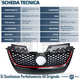 GRIGLIA MASCHERINA per Volkswagen Golf 5, GTI Style a Nido d' Ape, in Abs Nero Lucido con Righini Rossi | Montaggio Perfetto PLUG and PLAY - Look Rinnovato e Sportivo | GTI Style - Rifiniture Estreme | Eccellenza dei Materiali, Dettaglio, Tatto - Facile Installazione | Ricambio Perfetto, NO Adattamenti o Modifiche - Garantita a Vita | Resistente agli Agenti Atmosferici e Alte Temperature, NO Scolorimento - Qualità Professionale | Aderenza perfetta INFO: Rinnova il Look della Tua Golf 5, sostituendo alla Griglia di Serie, la Griglia a Nido d' Ape GTI Style, Ispirata alla Versione Sportiva. Mascherina in finitura Nero Lucido, di qualità eccellente nella scelta dei materiali, Rifiniture del Dettaglio, tatto, e colorazione. Si sostituisce SENZA MODIFICHE alla Griglia Originale e funge da semplice ricambio Tuning della propria. COMPATIBILITÀ: - Per GOLF 5 (2003-2009) **SOLO per modelli con Paraurti GTI** MONTAGGIO: - Semplicemente da sostituire all'attuale come perfetto Ricambio: COMPATIBLITA' TESTATA AL 100% - : LOGO NON INCLUSO, UTILIZZARE QUELLO DI SERIE DETTAGLI TECNICI: - Materiale: ABS Termico a pigmentazione - Colore: Nero Lucido - Finitura: Traslucida - Disegno Griglia: GTI Style - Verniciatura: Non Verniciata, ABS di Qualità - Peso: 806 Gr - Dimensioni: 82,3 Cm (L) x 38,5 Cm (H) x 5 Cm (P) - Resistenza Schiacciamento: 55Kg - Temperatura di lavoro Compresa tra - 28°C / + 45°C - Confezionamento: Box Cartone Originale PER INFO CONTATTARE AL 3927091031 ANCHE LINEA WhatsApp OPPURE VIA E-MAIL: rtautoitalia2018@libero.it CONSEGNA: - Effettuiamo Spedizioni 24-48H in TUTTA ITALIA - Ritiro in Sede con Possibilità di Visionare il Prodotto - Vendiamo solo Articoli Nuovi PAGAMENTI: - PayPal - Con Carta - Bonifico Bancario - Alla Consegna con Contrassegno