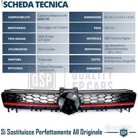 GRIGLIA MASCHERINA per Volkswagen Golf 7, GTI Style a Nido d' Ape, in Abs Nero Lucido con Righini Rossi | Montaggio Perfetto PLUG and PLAY - Look Rinnovato e Sportivo | GTI Style - Rifiniture Estreme | Eccellenza dei Materiali, Dettaglio, Tatto - Facile Installazione | Ricambio Perfetto, NO Adattamenti o Modifiche - Garantita a Vita | Resistente agli Agenti Atmosferici e Alte Temperature, NO Scolorimento - Qualità Professionale | Aderenza perfetta INFO: Rinnova il Look della Tua Golf 7, sostituendo alla Griglia di Serie, la Griglia a Nido d' Ape GTI Style, Ispirata alla Versione Sportiva. Mascherina in finitura Nero Lucido, di qualità eccellente nella scelta dei materiali, Rifiniture del Dettaglio, tatto, e colorazione. Si sostituisce SENZA MODIFICHE alla Griglia Originale e funge da semplice ricambio Tuning della propria. COMPATIBILITÀ: - Per GOLF 7 (2012-2017) Pre-Restyling MONTAGGIO: - Semplicemente da sostituire all'attuale come perfetto Ricambio: COMPATIBLITA' TESTATA AL 100% - : LOGO NON INCLUSO, UTILIZZARE QUELLO DI SERIE DETTAGLI TECNICI: - Materiale: ABS Termico a pigmentazione - Colore: Nero Lucido - Finitura: Traslucida - Disegno Griglia: GTI Style - Verniciatura: Non Verniciata, ABS di Qualità - Peso: 952 Gr - Dimensioni: 92 Cm (L) x 12 Cm (H) x 3,5 Cm (P) - Resistenza Schiacciamento: 55Kg - Temperatura di lavoro Compresa tra - 28°C / + 45°C - Confezionamento: Box Cartone Originale PER INFO CONTATTARE AL 3927091031 ANCHE LINEA WhatsApp OPPURE VIA E-MAIL: rtautoitalia2018@libero.it CONSEGNA: - Effettuiamo Spedizioni 24-48H in TUTTA ITALIA - Ritiro in Sede con Possibilità di Visionare il Prodotto - Vendiamo solo Articoli Nuovi PAGAMENTI: - PayPal - Con Carta - Bonifico Bancario - Alla Consegna con Contrassegno