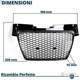 Griglia Anteriore Completa di Logo e Portalogo per AUDI TT(8J) 06-14, Calandra a Nido d'Ape RS Style, in Abs Nero Lucido | MontaggioPerfetto PLUG and PLAY - Look Rinnovato Rs | Nido d'Ape Ispirazione RS Style. - Ricambio Perfetto | NO Adattamenti o Modifiche. - Rifiniture Estreme | Eccellenza Garantita dei Materiali,Dettagli, Tatto. - Garanzia a Vita | Resistente agli Agenti Atmosferici,Temperature, NOScolorimento - Porta Targa Nero Lucido Incluso + Predisposizione Sensoridi Parcheggio + Logo con Portalogo INFO: Rinnova il Look della Tua Audi TT sostituendo alla Grigliadi Serie, la GrigliaRs Style nero Lucido, Ispirata alle più Recenti Audi Rs. Mascherina in finitura Nero Lucido, di qualità eccellentenella scelta deimateriali, Rifiniture del Dettaglio, tatto, e colorazione. Si sostituisce SENZA MODIFICHE alla Griglia Originale efunge da semplicericambio Tuning della propria. COMPATIBILITÀ: - Per AUDI TT (8J), 2006-2014 - Per AUDI TT S-LINE (8J), 2006-2014 - Compatibile con le Versioni: Coupè, Roadster ** ! NON COMPATIBILE con Versione RSTT** MONTAGGIO: - Semplicemente da sostituire all’attuale come perfettoRicambio: COMPATIBLITA'TESTATA AL 100% DETTAGLI TECNICI: - Materiale: ABS Termico a Pigmentazione - Colore: Nero Lucido - Finitura: Traslucida - Disegno Griglia: Rs, a Nido d'Ape - Verniciatura: Non Verniciata, ABS di Qualità - Peso: 1532 Gr - Dimensioni: 960 mm (L) - 500 mm (H) - 10mm (P) - Resistenza Schiacciamento: 55Kg - Temperatura di lavoro Compresa tra - 28°C / + 45°C - Confezionamento: Box Cartone Originale