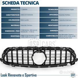 Griglia Calandra Anteriore per Mercedes Classe E(W213, S213) Restyling (20-23), Calandra AMG GT-R Style, in Abs Nero Lucido |Montaggio Perfetto PLUG and PLAY **NON è incluso il Logo, è possibile utilizzare quello di Serie** - LOOK RINNOVATO | Ispirazione AMG GT-R Style. - RICAMBIO PERFETTO | NO Adattamenti o Modifiche. - RIFINITIRE ESTREME | Eccellenza Garantita dei Materiali, Dettagli, Tatto. - GARANZIA A VITA | Resistente agli Agenti Atmosferici, Temperature, NOScolorimento. INFO: Rinnova il Look della Tua Mercedes Classe E sostituendo alla Griglia di Serie,la Griglia GT-R Style nero Lucido, Ispirata alle più Recenti Mercedes AMG GT. Mascherina in finitura Nero Lucido, di qualità eccellente nella scelta deimateriali, Rifiniture del Dettaglio, tatto, e colorazione. COMPATIBILITÀ: - MERCEDES CLASSE E (W213) Restyling, 2020-2023 - Con e Senza TelecameraFrontale - MERCEDES CLASSE E (S213) Restyling, 2020-2023 - Con e Senza TelecameraFrontale - MERCEDES CLASSE E (C238) Restyling, 2020-2023 - Con e Senza TelecameraFrontale - MERCEDES CLASSE E (A238) Restyling, 2020-2023 - Con e Senza TelecameraFrontale **NO E63 AMG** MONTAGGIO: - Semplicemente da sostituire all'attuale come perfetto Ricambio: COMPATIBLITA'TESTATA AL 100% DETTAGLI TECNICI: - Materiale: ABS Termico a pigmentazione - Colore: Nero Lucido - Finitura: Traslucida - Disegno Griglia: AMG GT-R Design - Verniciatura: Non Verniciata, ABS di Qualità - Peso: 1135 Gr - Dimensioni: 1150 mm (L) - 320 mm (H) - 30mm (P) - Resistenza Schiacciamento: 55Kg - Temperatura di lavoro Compresa tra - 28°C / + 45°C - Confezionamento: Originale PER INFO CONTATTARE AL 3927091031 ANCHE LINEA WhatsApp CONSEGNA: - Effettuiamo Spedizioni 24-48H in TUTTA ITALIA - Ritiro in Sede PAGAMENTI: - PayPal - Con Carta - Bonifico Bancario - Alla Consegna con Contrassegno