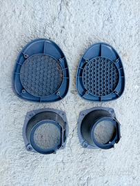 coppia di supporti e griglie altoparlanti per montare le casse nelle porte, come con optional radio originale, per Renault Clio prima serie 3 e 5 porte, si possono montare in tutti gli allestimenti comprese 16v e Williams. sagoma pannello per taglio e cablaggio solitamente già presente