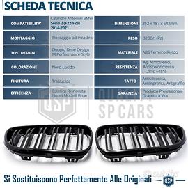 MASCHERINE Anteriori per Bmw SERIE 2 (F22-F23) Griglie DOPPIO RENE in Abs NERO Lucido | Montaggio Perfetto PLUG and PLAY - Look Rinnovato e Sportivo | Design Doppio Rene, Ispirazione M Performance - Rifiniture Estreme | Eccellenza dei Materiali, Dettaglio, Tatto - Facile Installazione | Ricambio Perfetto, NO Adattamenti o Modifiche - Garantite a Vita | Resistenti agli Agenti Atmosferici e Alte Temperature, NO Scolorimento - Qualità Professionale | Aderenza perfetta COMPATIBILITÀ: - Per BMW SERIE 2 (F22-F23) 2014-2021 MONTAGGIO: Semplicemente da sostituire alle attuali come perfetto Ricambio: COMPATIBLITA' TESTATA AL 100% INFO: Rinnova il Look della Tua Bmw, sostituendo alla Griglia Silver di Serie, la Griglia Nero Lucido, Ispirata alle più Recenti Bmw M Performance. Mascherina in finitura Nero Lucido, di qualità eccellente nella scelta dei materiali, Rifiniture del Dettaglio, tatto, e colorazione. Dettagli Tecnici - IL PACCO INCLUDE: 2 Calandre - COLORE: Nero Lucido - CARATTERISTICA: Doppio Rene - ATTACCO: Come Originale - TECNOLOGIA: Trasformazione Griglia - UTILIZZO: Calandra Anteriore - EFFICIENZA: Ricambio Perfetto - MONTAGGIO: Ad incastro (per contatto) - MATERIALE: New Abs Termico - RESISTENZA: Raggi Uv, Pioggia, Neve, Tempesta, Gelo, Polvere, Insetti, Volatili ed Escrementi - DURATA STIMATA: Massima Resistenza Garantita - SPECIFICHE AGGIUNTIVE: Prodotto Professionale PER INFO CONTATTARE AL 3927091031 ANCHE LINEA WhatsApp OPPURE VIA E-MAIL: rtautoitalia2018@libero.it CONSEGNA: - Effettuiamo Spedizioni 24-48H in TUTTA ITALIA - Ritiro in Sede con Possibilità di Visionare il Prodotto - Vendiamo solo Articoli Nuovi PAGAMENTI: - PayPal - Con Carta - Bonifico Bancario - Alla Consegna con Contrassegno