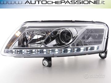 Gruppi ottici anteriori cromati per AUDI A6 4F 06/2004>10/2008 (-S6/RS6) con frecce integrate e luci diurne a led (per vetture con kit Xenon di serie)Dati tecnicicon correttore elettrico altezza fari: si recupera il motorino elettrico originaleLampadine: D2S anabbagliante /H1 abbaglianteInformazioni 'D-LITE':Il nuovo marchio ''D-lite' sviluppa Gruppi ottici con strisce a LED dotate di omologazione R87. Queste luci sono equiparabili alla vere LUCI DIURNE che all' accensione