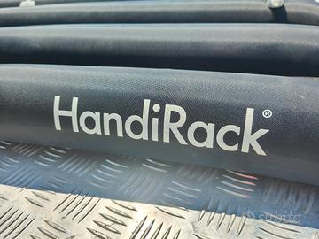 L'HandiRack è fatto da un resistente nylon 400 denari con 5 punti di ancoraggio a D per un trasporto extra sicuro; il sistema HandiRack è leggero ma resistente, con una capacità di carico fino a 80 kg; è certificato per l'uso fino a velocità autostradali.