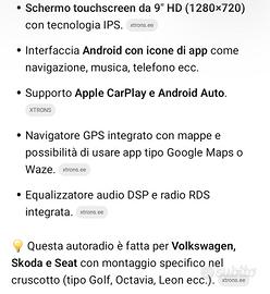 Vendo,causa cambio auto,autoradio Apple CarPlay/Android auto mod.XTRONS PEX92MTVL(inclusi cablaggi)specifico per Volkswagen-Skoda-Seat quindi progettata per entrare nel cruscotto originale senza modifiche. Autoradio perfetta in tutto(vedesi foto),a richiesta mando il video del corretto funzionamento. VERO AFFARE!