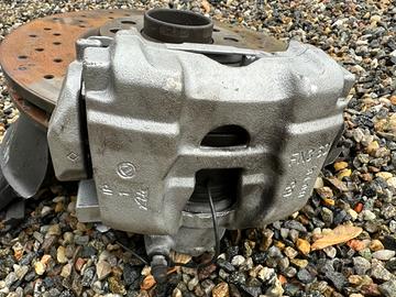 Impianto frenante anteriore marca Brembo con dischi forati, pinze e pastiglie.