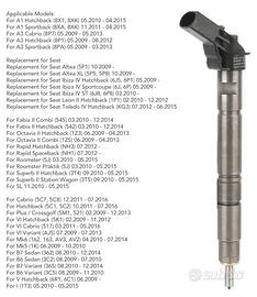 • Compatibile con Audi A1 2010-2015, A1 Sportback 2011-2015, A3 Cabrio 2009-2013, A3 Berlina 2009-2012, A3 Sportback 2009-2013. Compatibile con Seat Altea 2009, Altea XL 2009, Ibiza IV Hatchback 2009, Ibiza IV Sportcoupe 2009-, Ibiza IV ST 2010-, Leon II Hatchback 2010-2012, Toledo IV Hatchback 2012-2015. Compatibile con Skoda Fabia II 2010-2014, Octavia II 2009-2013, Rapid Hatchback 2012-, Rapid Spaceback 2012-, Roomster 2010-2015, Superb II 2010-2015.