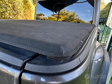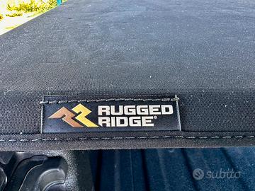 Copricassone jeep gladiator Rugged Ridge in buone condizioni, purtroppo in due punti dove si piega, come da foto, ci sono due piccolo strappi funziona perfettamente e non entra acqua perche h doppi foder interna in pvc e a vederlo sta ancora benissimo
