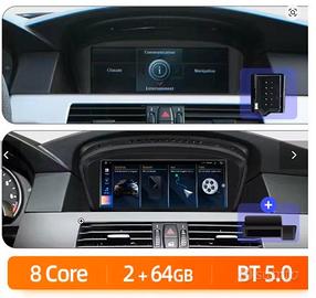 Sostituisce il monitor originale della vecchia auto (BMW serie 5 e 6) CCC con un monitor touch screen Android con tutte le moderne funzioni come navigatore, bluetooth, radio, telecamera a 360° comandabile anche da iDrive.