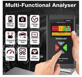 BM580 MarchioKINGBOLEN Sorgente di alimentazioneA batteria StileBattery Tester Colorenero Tensione di esercizio min.10 Volt (CC)formazioni su questo articolo 🔥【UNO STRUMENTO DOVUTO NEL TUO GARAGE】Kingbolen BM580 tester per batteria per tutte le batterie 12v, utilizza la più recente tecnologia di test, e si possono ottenere risultati accurati entro 3 secondi dal collegamento del tester. Controlla che la batteria del veicolo non sia difettosa o da sostituire e le condizioni iniziali dell'alternatore. Tutto ciò che dovete fare è collegarlo alla batteria. Ciò consente di risparmiare tempo e denaro. 🔥【4 FUNZIONI DEL TEST】Tester della batteria dell'auto - per valutare se la batteria è in buone condizioni; ② Test di avviamento - per vedere se l'impianto elettrico ha abbastanza potenza per avviare il motore; ③ Test del sistema di carica - per verificare se l'alternatore funziona; ④ Test di carica - per controllare la batteria. La capacità di carica è sufficiente per far funzionare tutti i dispositivi elettronici? Questo pratico analizzatore di batterie per auto assicura che il vostro viaggio estivo non si concluda con un guasto. 🔥【AMPIO SPETTRO DI PROVA】Il tester per batterie auto KINGBOLEN BM580 può testare un'ampia gamma di batterie da 6V e 12V con capacità da 100 a 2000CCA o da 2AH a 200AH. Per le batterie più piccole di moto, ATV, barche e altre batterie, è disponibile una modalità di rilevamento a bassissima capacità di 2AH che consente di rilevare e segnalare con precisione queste batterie a bassa capacità. La maggior parte degli altri tester per batterie non dispone di questa funzionalità.