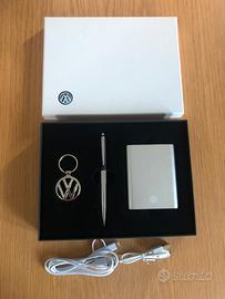 Kit accessori originali Volkswagen, contiene i seguenti accessori; - ciondolo portachiavi logo Volkswagen in acciaio 18/10. - penna a sfera in acciaio e caucciù con logo Volkswagen. - caricabatterie portatile 10400MHA tempo di ricarica 5 ore, cavi USB e micro USB. - pieghevole con istruzioni. Cofanetto portaoggetti in velluto completano la confezione originale Volkswagen.