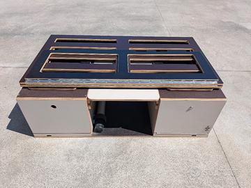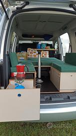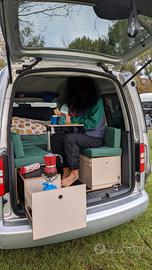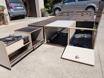 camperizzazione per caddy e auto simili, composta da due cassettoni e tavolino centrale. Si può utilizzare con o senza i sedili posteriori. Condizioni ottime. Vendo per cambio progetto. Materassi non compresi. larghezza 111cm lunghezza 72 cm altezza 33.5 cm materiale betulla molto resistente e rifiniture perfette. Disponibile da subito, ritiro a carico dell'acquirente. Prezzo leggermente trattabile.