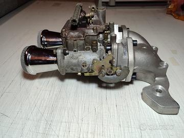 Carburatore revisionato completamente. Per elaborazione Fiat 500 Abarth / Giannini. Collettore di aspirazione per carburatore doppio corpo d.40 su testata 500/126 – distanziale tra carburatore doppio corpo e collettore da 40 mm - Tromboncini cromati nuovi.