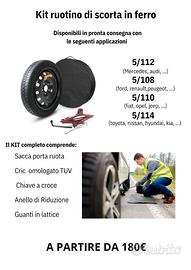 Vendo ruotino di scorta universale, completo di tutti gli accessori per un intervento rapido e sicuro in caso di emergenza.