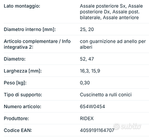 Vendo cuscinetto ruota RIDEX nuovo, mai montato, acquistato per errore. Compatibile con diversi modelli come Chevrolet Matiz, Daewoo Matiz e Chevrolet Spark (motori 0.8 / 1.0 anche GPL). Caratteristiche: Kit completo per una ruota Cuscinetto a rulli conici Diametri: 52 / 47 mm Include paraolio Codice prodotto: 654W0454 ⚠️ ATTENZIONE: Non adatto a tutte le versioni (es. alcune con ABS anteriore). Verificare compatibilità con il proprio veicolo prima dell’acquisto. Condizioni: ✔️ Nuovo ✔️ Mai montato ✔️ Con confezione originale