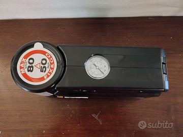 Il kit include un compressore portatile a 12V che si collega alla presa accendisigari dell'auto.