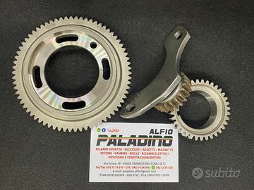 kit distribuzione ingranaggi per applicazioni su motori 500/126,permette di eliminare il sistema tradizionale a catena, gli ingranaggi sono rettificati per ridurre rumori ed attriti, il supporto centrale è ricavato da lavorazione CNC da un singolo pezzo.