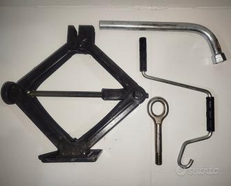 Il kit comprende anche crick con manovella, chiave per smontaggio dadi/bulloni e gancio traino.