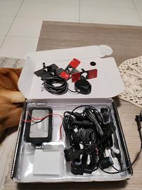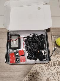 Kit 4 sensori parcheggio completo di 4 sensori completi di cavi, 4 staffe sensori adesive, buzzer completo di cavo e interruttore regolazione volume, centralina sensori e cavo di alimentazione