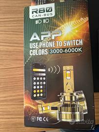 Lampadina per fari a LED H1, H4, H7, H11, 9005 CAN-BUS R80. Include la funzione "CON APP" che consente agli utenti di cambiare il colore tra 3000K e 6000K tramite telefono. Progettata per sostituire le lampade ad alta luminosità con le luci tradizionali H1, H4, H7, H11, 9005, in particolare per condizioni di luce soffusa o intensa. La confezione indica la compatibilità con CAN-BUS, il che aiuta a evitare messaggi di errore nei sistemi dei veicoli moderni.
