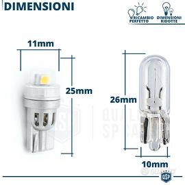 2 Lampadine Led T10 - W5W Professionali | Luce Bianca Potente e ""Diffusa"" - CANbus NO Errori - Plug & Play | 400 LUMEN Totali - Illuminazione Potente e Diffusa - Look Rinnovato Bianco Ghiaccio | 6500K - No Errori | CANbus - Ricambio Perfetto | Plug & Play UTILIZZI SUGGERITI: - Luci Abitacolo - Luci di Posizione - Luci Targa COMPATIBILITÀ: - Vetture Con Lampada Alogena T10 - W5W - Montaggio Plug & Play INFO: Lampadine LED per Coversione da Lampadine Alogena Originale T10 - W5W a Luce LED Bianca Intensa, Senza Errori e Modifiche. - LUCE DIFFUSA: La Copertura Led Opaca, con trasparenza all' 85%, offre una Luce Trasmessa e Diffusa, creando un effetto di Luce Accogliente ed Elegante, sia all' interno dell'Abitacolo, se utilizzata per Luci Interne, che nel Faro, se utilizzata per Luci Esterne. - CANBUS IC CHIPS: Centralina A CONTROLLO DINAMICO, l 'elemento CANBUS DELLA LAMPADA; lavora con le 6 resistenze (di qui il nome dynamic) e PERMETTE LA NON PRESENZA DELL'ERRORE sul computer di bordo - 2 LED SMD 2835: 4 LED Totali. Tipologia di led applicati su ogni singolo Chip, riesce a fornire più di 100 LUMEN a Led ad ampio raggio con maggiore intensità e brillantezza. SCHEDA TECNICA: - Tipo: T10 - W5W - Colore: 6500K (Bianco Ghiaccio) - Materiale: Alluminio + Circuiti in Fibra di vetro - N° Led: 2 LED con Cover Opaca (ognuna) - Tipo Led: SMD 2835 - Potenza: 200 Lumen - 5W (ognuna) - Voltaggio: 9-18V - Canbus: SI - Lunghezza: 25mm - Diametro Ø: 11mm - Tecnologia: FULL LED - Resistenza a polveri ed Acqua: IP67 - Temperatura di Lavoro: -40C° +85C° - Applicazione: Ricambio Perfetto - Confezione o Scatolo: Originale - Condizioni: Nuovo PER INFO CONTATTARE AL 3927091031 ANCHE LINEA WhatsApp VIA E-MAIL: rtautoitalia2018@libero.it CONSEGNA: - Effettuiamo Spedizioni 24-48H in TUTTA ITALIA - Ritiro in Sede PAGAMENTI: - PayPal - Con Carta - Bonifico Bancario - Alla Consegna