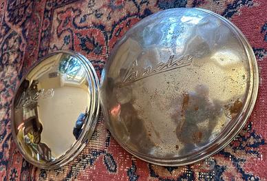 Vendo due coppe - borchie per ruote Lancia Aurelia. Originali, autentiche, non riproduzioni. Condizioni come da foto.