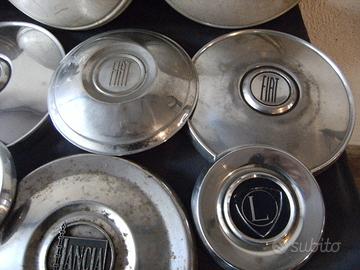Vendo lotto composto da 12 borchie metalliche coprimozzo per ruote di auto classiche, nel dettaglio: n.3 borchie Lancia diametro esterno 15,7 cm; n.2 borchie Lancia diametro esterno 26,1 cm; n.3 borchie Fiat diametro esterno 24,9 cm; n.1 borchia Fiat con zigrinatura diametro esterno 24,9 cm; n.1 borchia Fiat diametro esterno 21,2 cm; n.1 borchia Fiat diametro esterno 18,4 cm; n.1 borchia Volkswagen diametro esterno 25,7 cm.