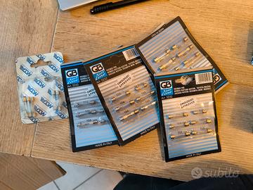lotto composto da fusibili powerval 100A=6pz 125A=22pz 150A=2pz 225A=18pz 250A=11pz 500A=4pz cal1=14pz cal2=12pz cal3=8pz cal4=6pz cal5=2pz fusibili lamellari 8A=1000pz 16A=800pz 25A=700pz Fusibili a nastro 40A=100pz 60A=100pz 80A=300pz 100A=300pz fusibili a lampadine 6 scatoline con vari amperaggi 35pz totali