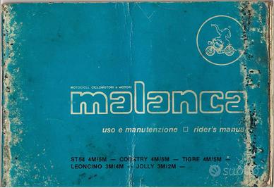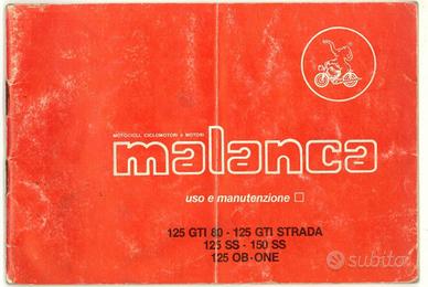 Vendo manuali officina manuali part list con esplosi e manuali uso e manutenzione per motori Malanca e moto Malanca d'epoca storiche vintage per motori 50 monocilindrici e 80 125 150 bicilindrici manuale officina per motori dei seguenti modelli Modello Z-Modello M2-Modello 3M-4M-5M D-D2-125E2CS-125SPORT-150GT-150 3GTS esplosi motori GTI80-125E2C-125E2CS-150GT e manuali ciclistica per 125E2C STRADA-Sport 125GT STRADA-SPORT GTI80 OB-ONE prima serie e OB-ONE 6M MARK da enduro contatttate specificando modello e anno di produzione e vi comunicherò la disponibilità o l'alternativa più consona. moto d'epoca storiche vintage. una guida fotografica che segue passo passo lo smontaggio e il rimontaggio del motore con controlli dimensionali e geometrici dei vari pezzi del motore ciclistica telaio impianto elettrico con schemi e fotografie e completo di coppie di serraggio una guida completa. Dispongo di altri manuali per moto d'epoca storiche vintage di altre marche italiane e europee americane giapponesi di alre cilindrate e altri anni e altre marche di moto e auto anche d'epoca cottattate potrei avere quello che cercate é preferibile il contatto con email massimibachiocciolagmailpuntocom poichè con il cotatto tramite questo sito capita che le mie risposte poi non arrivino