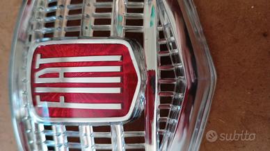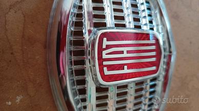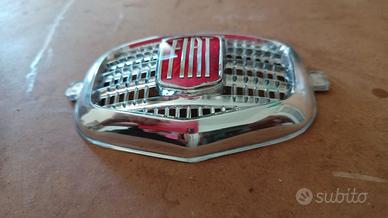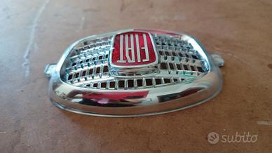 Fregio centrale anteriore, SENZA BAFFI, in plastica cromata, con scritta Fiat su base rossa (tipo originale), sulla calandra anteriore, adatto a modelli FIAT 500 N - D - F prima serie tipo 110. Articolo NUOVO senza scatola originale.