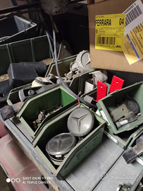 Molle gialle anteriori 50, ventola radiatore 50, barra stabilizzatrice 50, cambio 4marce 300, cinture anteriori 100, trasmissione 150, porte ant.100 cad, paraspruzzi anteriori 30 cad, gancio traino militare 100, cassa portafiltro 50, frecce arancio anteriori 15 cad, fari anteriori 30, modanature gomma laterali da 50 a 100 cad, scocca completa da restaurare 500, portaruota di scorta tondo 50, cancelletto portaruota cabrio 300, hard top per cabrio senza portellone 250 e altro