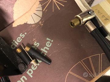 Comprende: scatola originale (rovinata), presa 12V per auto, manometro per controllare la pressione di gonfiaggio, ugelli adattatori per gonfiare ruote di bicicletta, materassini e spillo per palloni.