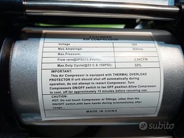 Vendo x inutilizzo(solo provato) minicompressore x auto/bici etc. A doppio cilindro, a 12 Volt max 200 psi/15 Bar, max 30 A. Attacco con morsetti su batteria , ha alcuni accessori anche x bici canotto palloni come da foto, manualetto istruzioni e imballo originale , peso 1360 gr. circa.