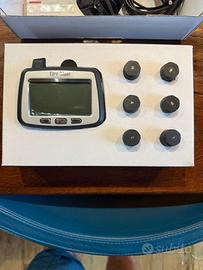 MISURATORE PRESSIONE E TEMPERATURA PNEUMATICI. Ideale per camper e furgoni con 6 ruote (pneumatici gemellati o assi doppi). Mostra continuamente la pressione attuale di tutte e 6 le ruote ed è espandibile fino a un massimo di 10 sensori/ruote. Solo con questo dispositivo avrete la certezza di viaggiare sempre con la pressione ottimale dei pneumatici. In caso di allerta (perdita di pressione), riceverete un avviso visivo e acustico tramite retroilluminazione e segnalatore. Si installa in soli 5 minuti e non necessita di inizializzazione; le batterie sono sostituibili. USATO SOLAMENTE UN ANNO, VENDO PER VENDITA CAMPER SUL QUALE ERA MONTATO