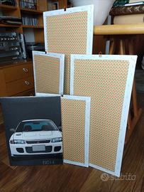 Composizione di 5 quadretti che -uniti- riproducono il frontale della versioni dalla I alla X della Mitsubishi Lancer Evolution, come da foto. Dimensioni: 30 cm. di base ognuno; altezza 40 cm. i due ai lati esterni della composizione, altezza 60 cm. il secondo ed il penultimo da sinistra a destra, altezza cm. 80 quello centrale. Tela plastificata stampata a colori , montati su telaio in legno, con gancio centrale in alto per appenderli a parete.
