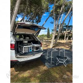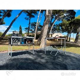 PRODOTTO NUOVO IN CONFEZIONE ORIGINALE SPEDIZIONE IN TUTTA ITALIA: 10€ Misure disponibili: 95x50 oppure 100x50 (10€ in più) Il Kitch&Box è un mobile da cucina outdoor compatto e multifunzionale, disponibile in due misure (95×50 o 100×50 cm). Perfetto per cucinare in viaggio, offre lavello integrato, piano in acciaio inox, coperchio trasformabile in tavolo e numerosi spazi di stivaggio. Leggero, resistente e facile da trasportare, permette di creare una cucina completa fuori dal veicolo o sotto il portellone posteriore. Il mobile da cucina Kitch&Box è la soluzione perfetta per chi viaggia in camper, auto o 4x4 e desidera una cucina outdoor completa, versatile e pratica. Progettato per essere utilizzato all’aperto o sotto il portellone posteriore del veicolo, Kitch&Box offre uno spazio cucina multifunzionale e ben organizzato, ideale per preparare i pasti in qualsiasi condizione. Disponibile nelle versioni da 95×50 cm o 100×50 cm, il mobile si adatta facilmente a diverse tipologie di veicoli e modalità d’uso. Grazie al suo design intelligente, può essere utilizzato come cucina con coperchio aperto, come mobile autonomo grazie ai piedini retrattili o come secondo tavolo rimuovendo il coperchio tramite il sistema a chiavistelli. La struttura in alluminio e il tessuto in poliestere 600D lo rendono leggero, resistente e perfetto per chi viaggia tutto l’anno. Il piano di lavoro in acciaio inox permette di cucinare e appoggiare pentole calde in totale sicurezza, mentre il coperchio in MDF è facile da pulire e trasformabile in comodo piano d’appoggio. Il Kitch&Box offre numerosi spazi e accessori integrati: una vaschetta per lavare i piatti, quattro ganci per utensili, un cestello per spezie, tasche portaoggetti, portasciugamani e una griglia metallica per posizionare una tanica collegabile a una doccetta. Le maniglie integrate facilitano il trasporto, mentre gli angoli protettivi in plastica evitano graffi e urti alla carrozzeria del veicolo.