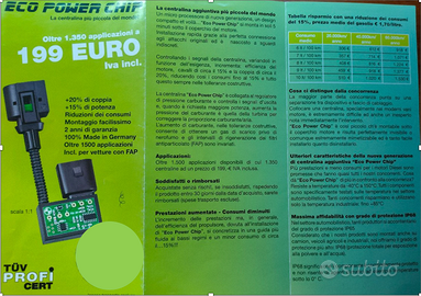 Eco Power Chip è la centralina più piccola del mondo, prodotta in Germania, riduce i consumi e aumenta la potenza tra il 15 e il 20% di potenza, senza danneggiare il motore. Ho venduto la macchina e il modulo aggiuntivo lo voglio vendere a parte perchè lo avevo appena comprato è praticamente nuovo. Tra l'altro è semplice da montare. Come vedete dalla brochure allegata in foto io l'ho pagato 199€, lo vendo a 100 €.