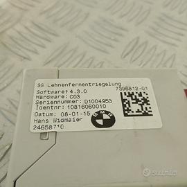 Modulo sblocco schienale sedili originale BMW per comando sblocco remoto degli schienali posteriori, smontato da veicolo compatibile BMW Serie 2 Active Tourer F45. Questo modulo, denominato SG Lehnenfernentriegelung, consente il comando elettronico per l`apertura remota degli schienali dei sedili posteriori tramite pulsante o comando del bagagliaio. Funziona in integrazione con l’elettronica di bordo e garantisce comfort e praticità nei modelli dotati di questa funzione.Ricambio conosciuto anche come: centralina sgancio schienale posteriore BMW, modulo comando apertura sedili, unità elettronica sgancio sedili, controller apertura schienali sedili, attuatore sblocco sedili posteriori, modulo elettrico apertura seduta posteriore.