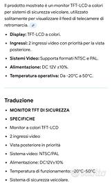il prodotto mostrato è un monitor TFT-LCD a colori per sistemi di sicurezza veicolare,utilizzato solitamente per visualizzare il feed di telecamere di retromarcia. -Display : TFT-LCD a colori -Ingressi : 2 ingressi video con priorità per la vista posteriore -Sistemi video : supporta formati NTSC e PAL -Alimentazione : DC 12V +_10% -Temperatura operativa : Da -20°C a 50°C