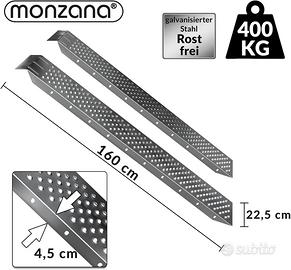 ROBUSTE E DUREVOLI: le due rampe di accesso MONZANA in acciaio zincato di alta qualità sono antiruggine e hanno una lunga durata. Ogni rampa può sopportare carichi fino a 200 kg per guida, mentre la capacità di carico totale per entrambe le rampe è di 400 kg.