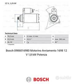 vendo motorino avviamento Bosch usato ma perfettamente funzionante. 12V 1,8 KW made in Germany (NO CINA!!!!) 10 denti. Si può montare su tutti i modelli Audi, Volkswagen, Seat, Skoda, Ford, ecc con il motore 1,9 TDI ( vedete compatibilità tramite il codice del prodotto). Prezzo da nuovo da 150 euro in su. Eventuale spedizione a carico dell'acquirente. No perditempo o affaristi. Grazie