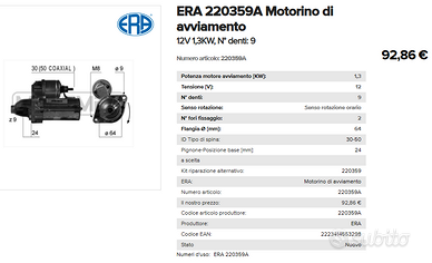 Codice ERA 220359A principalmente compatibile con i veicoli che montano il motore 1.3 MultiJet / CDTi.