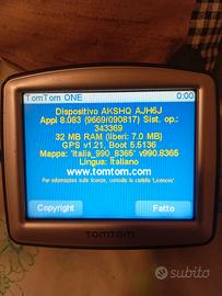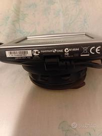 dispositivo navigatore satellitare portatile TomTom One.schermo touchscreen da 3,5 pollici con risoluzione di \(320\times 240\) pixel. Utilizza mappe Teleatlas precaricate per la navigazione stradale. Include un database di punti di interesse (POI) come stazioni di servizio e ristoranti. Il dispositivo è alimentato da una batteria interna ricaricabile con un'autonomia dichiarata di circa 3 ore. Compreso di aggancio a ventosa, cavo USB e cavo con spinotto accendisigari veicolare. Bene funzionante