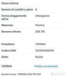 Kit pedale acceleratore Topran 208 745, valido per diversi modelli di Opel Corsa e Fiat 500. Nelle foto c'è una lista di modelli, poi sono disponibile a verificare se il vostro veicolo è adatto.