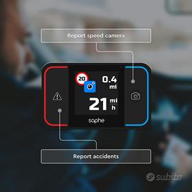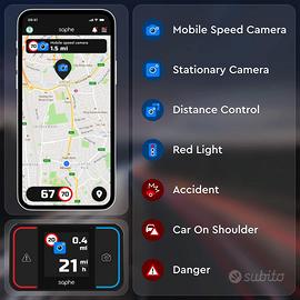 Sistema avanzato di avviso per il traffico e i limiti di velocitĂ , progettato per una guida piĂą sicura e attenta. NUOVO, SIGILLATO, con 12 mesi di abbonamento a Saphe Premium inclusi.
