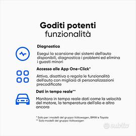 Informazioni su questo articolo Dispositivo diagnostico Bluetooth intelligente che ti consente di scansionare, leggere, condividere e cancellare i codici di errore sui tuoi veicoli Audi, Volkswagen, BMW, Mini, Skoda, Seat, Cupra, Lamborghini, Bentley, Rolls-Royce Con l'aiuto delle nostre app One-Click sviluppate, puoi abilitare o disabilitare determinate funzioni, attivare mod retrofit come sensori di parcheggio o ripristinare gli intervalli di manutenzione dopo aver eseguito la manutenzione di base sul tuo veicolo senza strumenti automobilistici Scansiona le unità di controllo all'interno della tua auto per diagnosticare eventuali problemi con motore, trasmissione, ABS, airbag, multimedia, aria condizionata, elettronica, piantone dello sterzo e assistenza, elettronica delle portiere e altre funzioni di comfort, il tutto con il nostro dispositivo diagnostico Bluetooth intelligente che è un lettore di codici per auto La piena funzionalità è sbloccata con tutti i marchi del Gruppo Volkswagen, inclusi Volkswagen, Audi, Seat, Skoda, Lamborghini e Bentley. In qualità di scanner per auto di terze parti ufficialmente approvato, OBDeleven ha pieno accesso anche ai modelli più recenti che sono stati immessi sul mercato da VAG OBDeleven è compatibile con Android 6.0 e versioni successive, iOS 15 e versioni successive e dispositivi dei sistemi operativi Huawei, consentendo la piena funzionalità tramite Bluetooth per connettersi alla tua auto e iniziare a lavorare con essa istantaneamente